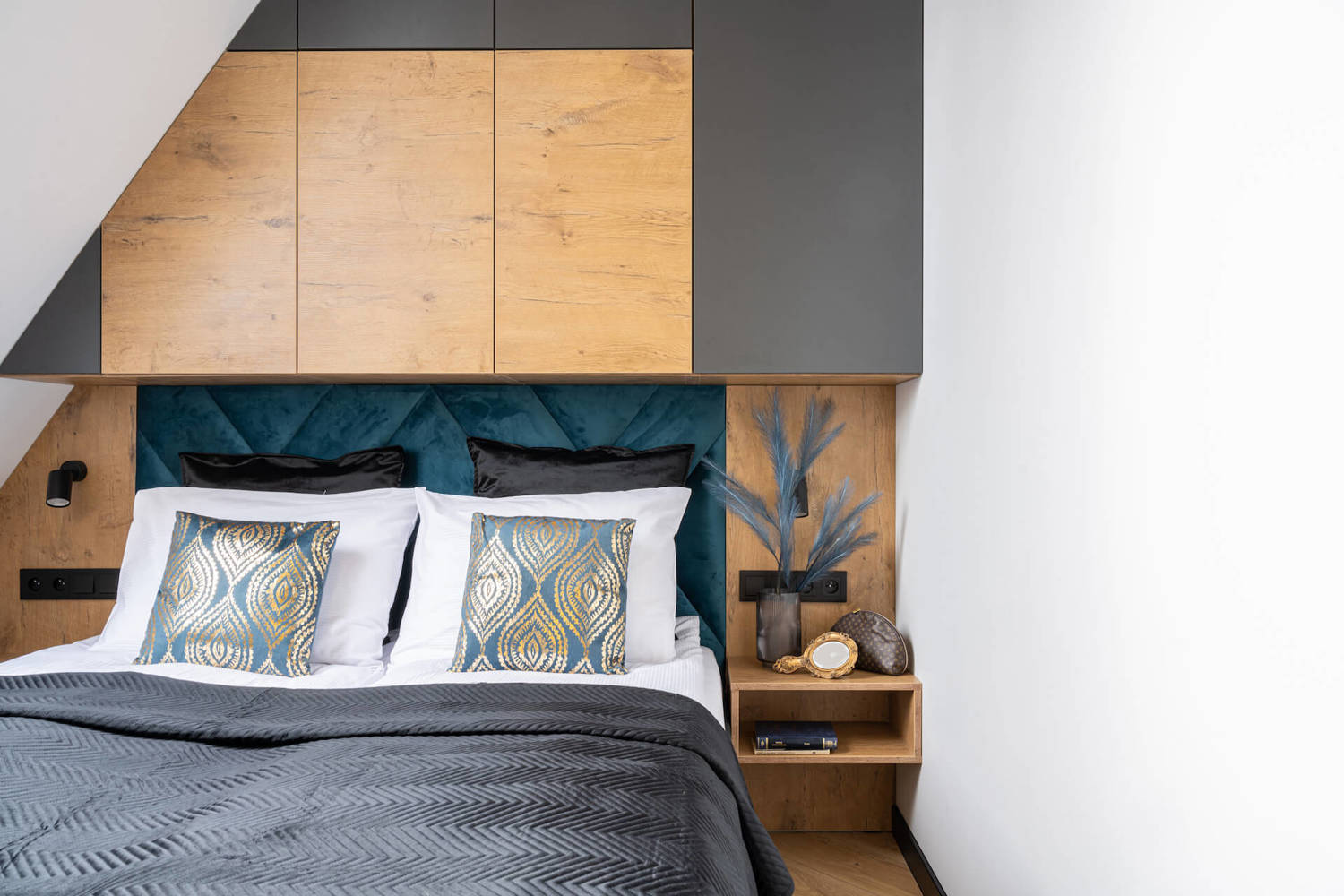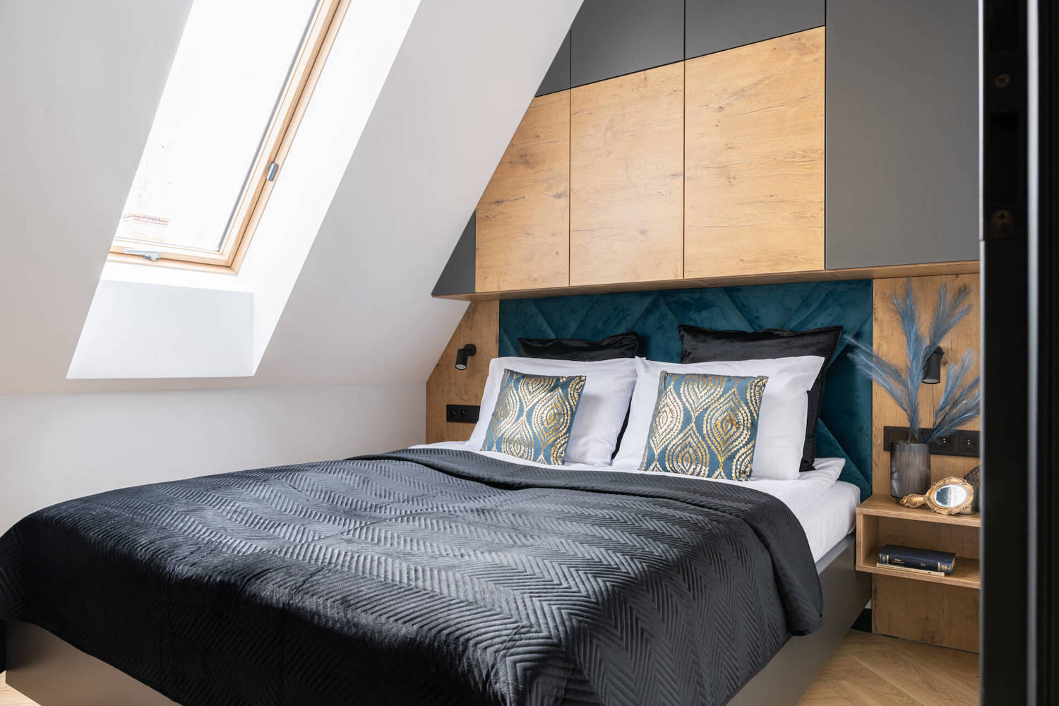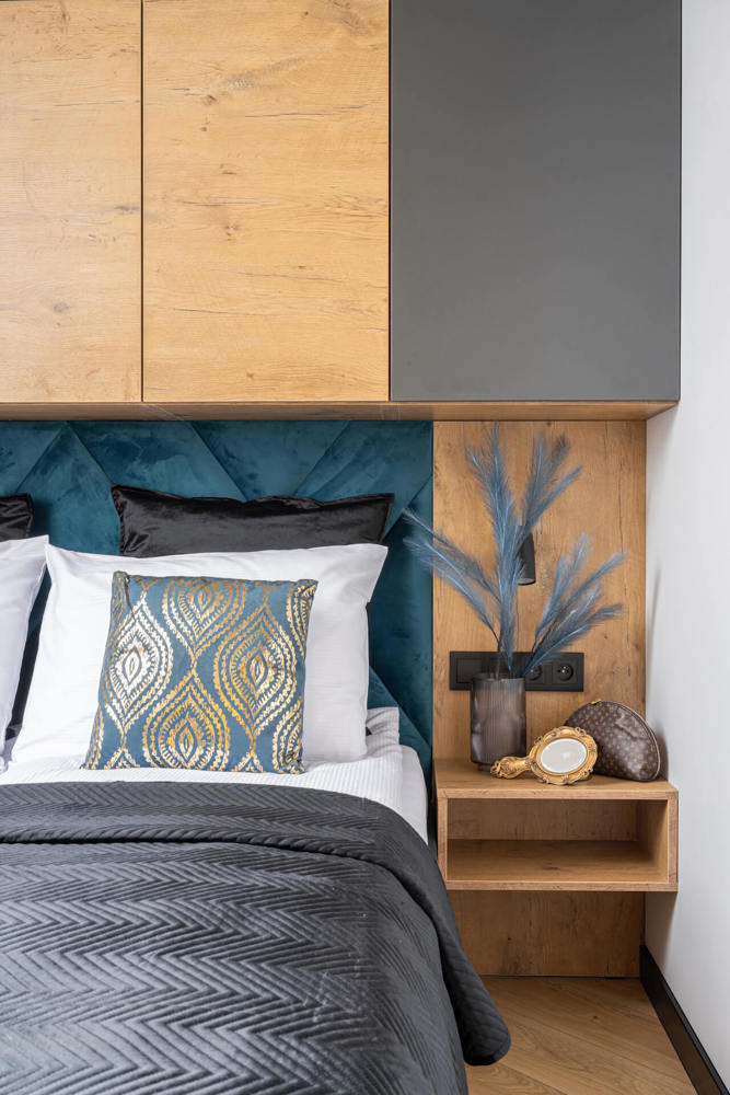 A spacious studio with a large double bed and a living room with a kitchenette as well as a bathroom with a shower.
